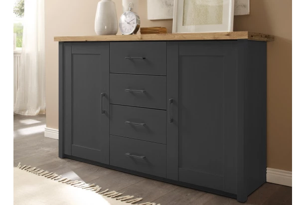 Široká komoda so zásuvkami uprostred z kolekcie Locarno – elegantný vidiecky štýl podčiarkujú dekoratívne reliéfy predných plôch a kombinácia grafitovej farby s útulnými tónmi drevodekoru dub artisan. Skrinka so šírkou 150 cm ponúka kombináciu zásuviek aj dverí pre prehľadné ukladanie.