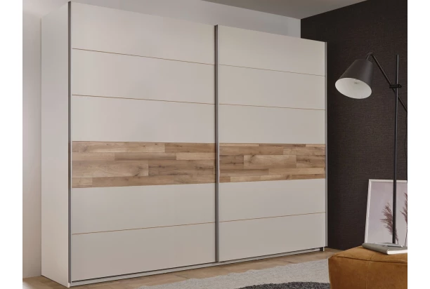 Šatníková skriňa so šírkou 270 cm s posuvnými dverami zo spálňovej kolekcie Cadora – moderný dizajn v drevodekore parketového dubu s odtieňom šampaň si zamilujete, pretože dodá Vašej spálni veľmi príjemnú a útulnú atmosféru. Za posuvnými dverami nájdete úložné priestory, ktoré je možné doplniť o ďalšie police podľa potreby.