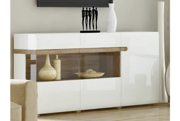 Široká komoda s presklením z programu Linate – štýlový nábytok so zaoblenými líniami pôsobí veľmi elegantne. Drevodekor dub Truffel vytvára s lesklými bielymi plochami príjemný kontrast a dokonale sa hodí do moderne zariadeného bytu. Rohové panoramatické presklenie navyše dodá interiéru vzdušnú atmosféru.