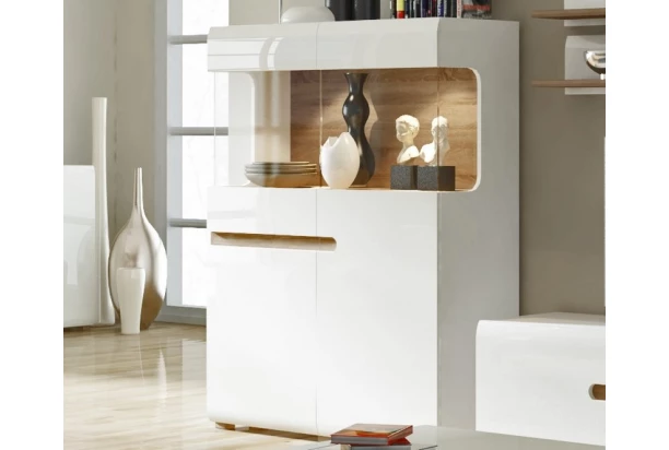 Nízka vitrína s presklením z programu Linate – štýlový nábytok so zaoblenými líniami, pôsobí veľmi elegantne. Drevodekor dub Truffel vytvára s lesklými bielymi plochami príjemný kontrast a dokonale sa hodí do moderne zariadeného bytu. Rohové panoramatické presklenie, navyše dodá interiéru vzdušnú atmosféru.
