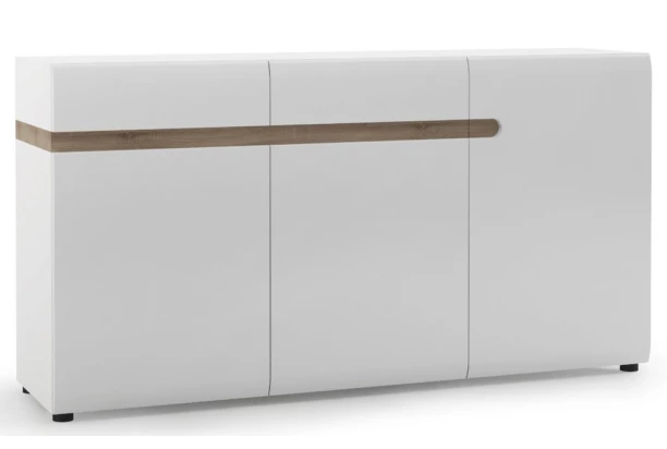 Široká úložná komoda z programu Linate – štýlový nábytok so zaoblenými líniami pôsobí veľmi elegantne. Drevodekor dub Truffel vytvára s lesklými bielymi plochami príjemný kontrast a dokonale sa hodí do moderne zariadeného bytu.