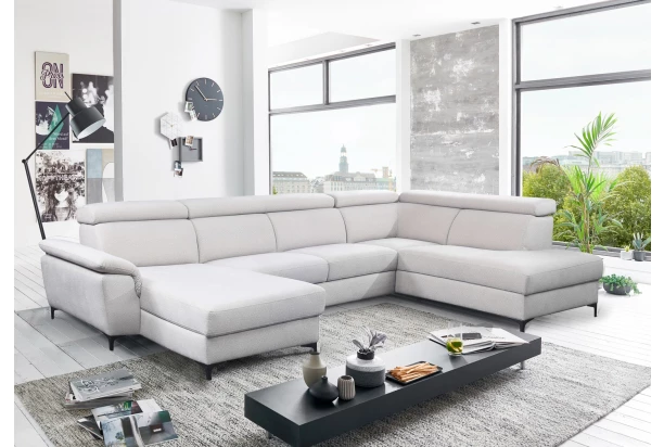 Priestranná sedacia súprava v tvare ľavé U uspokojí všetkých, ktorí majú radi moderný štýl, vysokú mieru pohodlia a zároveň ocenia praktickosť spolu so solídnym spracovaním. Očalúnená jemne štruktúrovanou látkou v tieni svetlo šedá. Pohodlné sedenie dopĺňajú polohovateľné opierky hlavy, funkcia rozkladu aj praktické úložné priestory pod oboma otomanmi. Variant sedačky s polohovateľnou podrúčkou na ľavej strane.