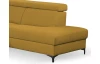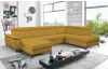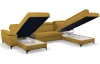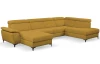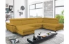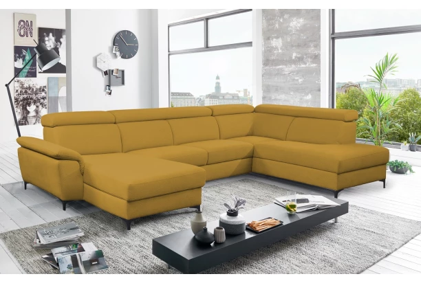 Priestranná sedacia súprava v tvare U uspokojí všetkých, ktorí majú radi moderný štýl, vysokú mieru pohodlia a zároveň ocenia praktickosť spolu so solídnym spracovaním. Očalúnená jemne štruktúrovanou látkou v otieni horčicová žltá. Pohodlné sedenie dopĺňajú polohovateľné opierky hlavy, funkcia rozkladu aj praktické úložné priestory pod oboma otomanmi. Variant sedačky s polohovateľnou podrúčkou na ľavej strane.