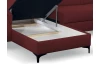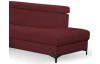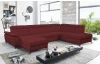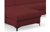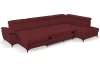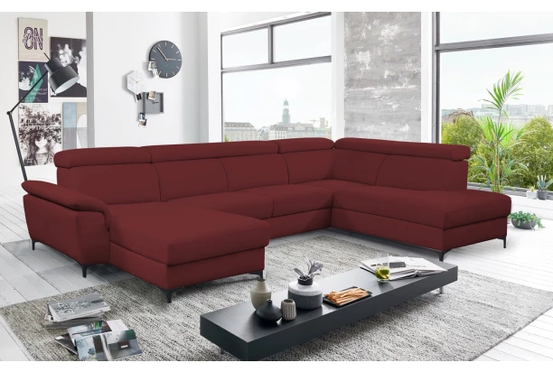 Priestranná sedacia súprava v tvare U uspokojí všetkých, ktorí majú radi moderný štýl, vysokú mieru pohodlia a zároveň ocenia praktickosť spolu so solídnym spracovaním. Očalúnená jemne štruktúrovanou látkou v odtieni tmavo červená. Pohodlné sedenie dopĺňajú polohovateľné opierky hlavy, funkcia rozkladu aj praktické úložné priestory pod oboma otomanmi. Variant sedačky s polohovateľnou podrúčkou na ľavej strane.