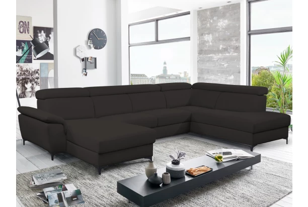 Priestranná sedacia súprava v tvare U uspokojí všetkých, ktorí majú radi moderný štýl, vysokú mieru pohodlia a zároveň ocenia praktickosť spolu so solídnym spracovaním. Očalúnená jemne štruktúrovanou látkou v odtieni tmavo šedá. Pohodlné sedenie dopĺňajú polohovateľné opierky hlavy, funkcia rozkladu aj praktické úložné priestory pod oboma otomanmi. Variant sedačky s polohovateľnou podrúčkou na ľavej strane.
