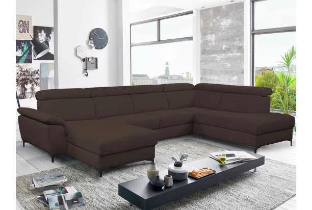 Priestranná sedacia súprava v tvare U uspokojí všetkých, ktorí majú radi moderný štýl, vysokú mieru pohodlia a zároveň ocenia praktickosť spolu so solídnym spracovaním. Očalúnená jemne štruktúrovanou látkou v odtieni čokoládová hnedá. Pohodlné sedenie dopĺňajú polohovateľné opierky hlavy, funkcia rozkladu aj praktické úložné priestory pod oboma otomanmi. Variant sedačky s polohovateľnou podrúčkou na ľavej strane.