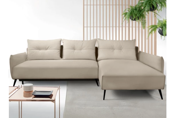 Doprajte si každodenné príjemné pohodlie a buďte jednoducho trendy. Pohodlná rohová sedacia súprava na čiernych kovových nohách pôsobí elegantne a vzdušne v každom priestore obývačky. Očalúnená mäkkou látkou v odtieni svetlo béžová. Vankúšová optika bočných podrúčiek šetrí okolité miesto a sedačkasa tak ľahko rozmerovo hodí do mnohých interiérov. Rohová sedačka s otomanom vytvára pravý roh.