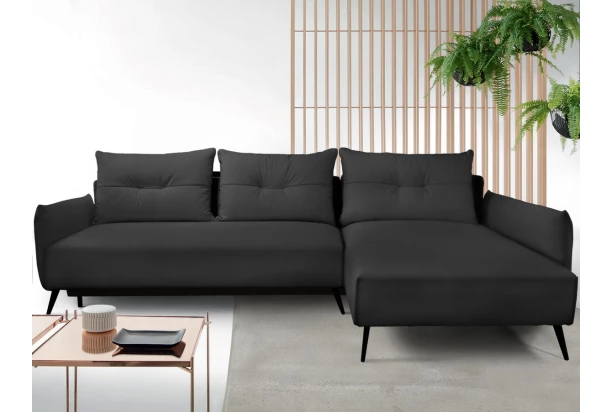 Doprajte si každodenné príjemné pohodlie a buďte jednoducho trendy. Pohodlná rohová sedacia súprava na čiernych kovových nohách, pôsobí elegantne a vzdušne v každom priestore obývačky. Očalúnená mäkkou látkou v odtieni antracitová tmavo šedá. Vankúšová optika bočných podrúčiek šetrí okolité miesto a sedačka tak ľahko rozmerovo pasuje do mnohých interiérov. Rohová sedačka s otomanom vytvára pravý roh.