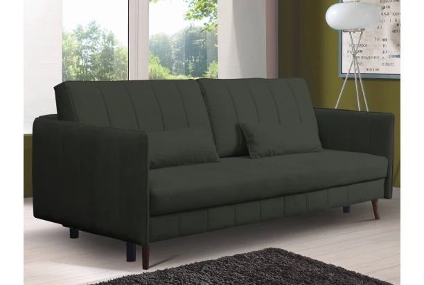 Elegantná pohovka s prešívaním poťahom je očalúnená látkou v odtieni tmavo zelená. Trojmiestny sedák s vankúšmi poskytuje dostatok priestoru na pohodlné sedenie. Praktickou stránkou pohovky je rozkladacia funkcia na lôžko a úložný priestor pod sedákom. Zámerne úzky dizajn bočných podrúčiek šetrí okolité miesto a pohovka sa tak rozmerovo hodí do mnohých interiérov.