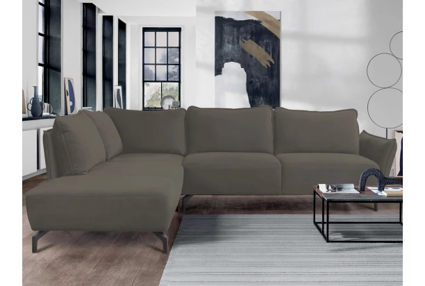 Atraktívna rohová sedacia súprava je inšpirovaná módnymi trendmi. Elegantný dizajn zaoblených tvarov, vankúšová optika aj kvalitné spracovanie. Sedačka s bočným otomanom vytvára ľavý roh a ponúka dostatok priestoru pre vašu každodennú pohodu. Užívajte si tak komfortne ladené sedenie, ktoré navyše spríjemňuje mäkká velúrová zamatová látka v odtieni svetlo hnedá. Čierne kovové nohy poskytujú sedačke stabilný základ a navyše dodávajú obývaciemu priestoru pocit vzdušnosti.