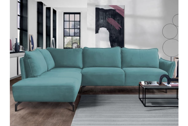 Atraktívna rohová sedacia súprava je inšpirovaná módnymi trendmi. Elegantný dizajn zaoblených tvarov, vankúšová optika aj kvalitné spracovanie. Sedačka s bočným otomanom vytvára ľavý roh a ponúka dostatok priestoru pre vašu každodennú pohodu. Užívajte si tak komfortne ladené sedenie, ktoré navyše spríjemňuje mäkká velúrová zamatová látka v odtieni modro-zelená aqua. Čierne kovové nohy poskytujú sedačke stabilný základ a navyše dodávajú obývaciemu priestoru pocit vzdušnosti.