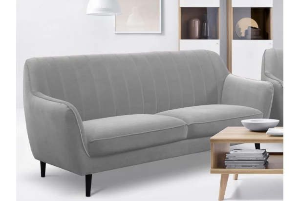 Elegantná trojmiestna pohovka na masívnych drevených nohách poskytuje výborný komfort vďaka kvalitnému vypolstrovaniu. Očalúnená zamatovo mäkkou látkou vo farbe svetlo šedá. Zaoblené tvary dopĺňa látkové lemovanie a zvislé prešitie. Svojím univerzálnym dizajnom sa pohovka hodí do rôzne zariadených interiérov – od škandinávskeho štýlu, cez retro, noblesnú klasiku, až po štýl domáckeho vidieka.
