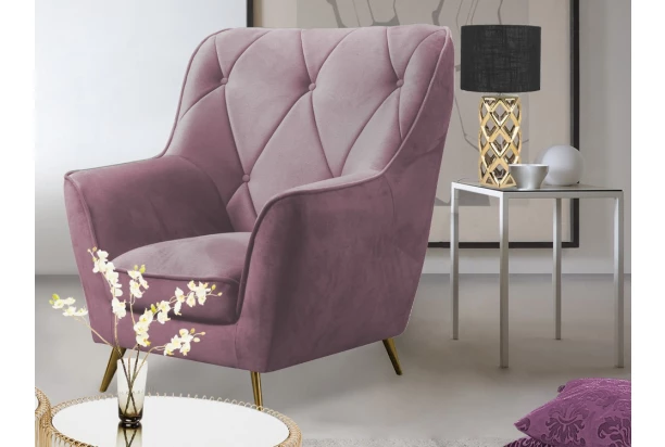 Kreslo s prešitím a gombíkmi vnesie do interiéru nádych luxusu a elegancie. Očalúnené zamatovo hebkou látkou v odtieni staroružová. Oceníte predovšetkým veľmi komfortné sedenie s vysokým operadlom, ktoré poskytne príjemnú oporu pre Váš chrbát aj hlavu. Kovové nohy v zlatej farbe pôsobia vzdušne a dotvárajú noblesný pocit.