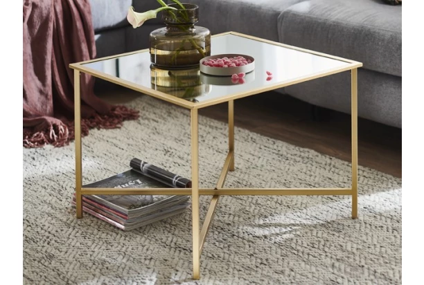 Štvorcový konferenčný stolík s veľkosťou 60×60 cm ,má kovovú konštrukciu v zlatej farbe a hornú plochu so zrkadlom – pôsobí tak luxusným dojmom.
