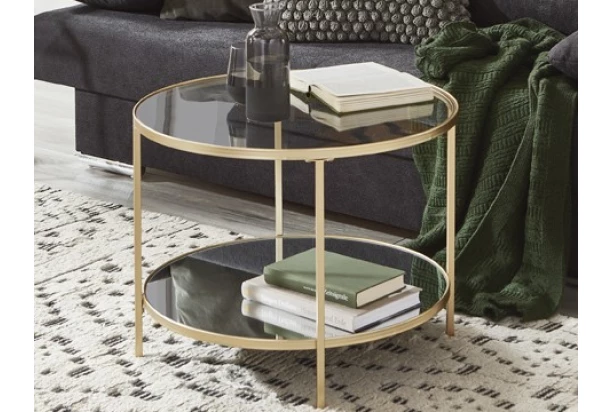 Okrúhly konferenčný stolík s priemerom 60 cm má stabilnú kovovú konštrukciu v prevedení zlatý lak a v interiéri tak pôsobí luxusným dojmom. Ponúka hornú a dolnú odkladaciu plochu z číreho a zrkadlového skla.