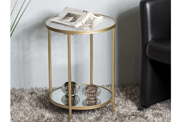 Okrúhly odkladací stolík s priemerom 39 cm má stabilnú kovovú konštrukciu v prevedení zlatý lak a v interiéri tak pôsobí luxusným dojmom. Ponúka hornú a dolnú odkladaciu plochu z číreho a zrkadlového skla. Stolík sa hodí nielen do obývačky.