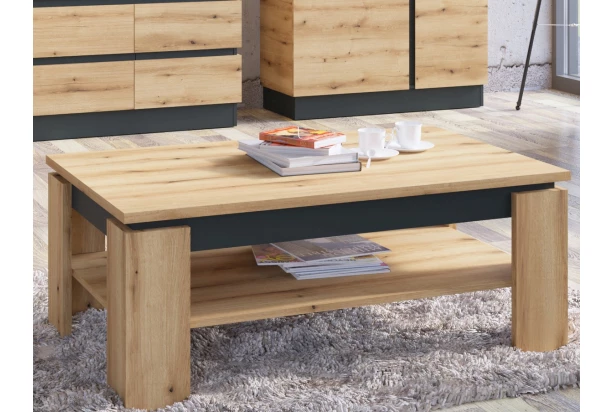 Konferenčný stolík z programu Corte – moderný minimalistický štýl s rovnými šedými líniami dáva vyniknúť prirodzeným tónom dubového drevodekoru. Môžete si tak zariadiť byt moderne a zároveň si zachovať útulnú atmosféru, kde sa cítite jednoducho doma.