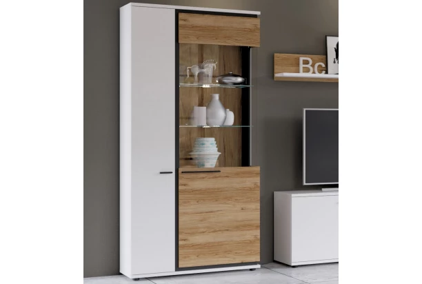 Vysoká vitrína z programu Salinas – originálne riešený nábytok v trojkombinácii biela, čierna a dubový drevodekor vytvára zaujímavú kompozíciu, ktorá vyzerá ako skladačka z kociek. Zaujme na pohľad v každom modernom byte.
