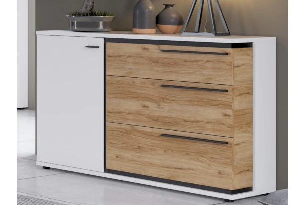 Komoda so šírkou 133 cm s otočnými dverami a zásuvkami z programu Salinas – originálne riešený nábytok v trojkombinácii biela, čierna a dubový drevodekor vytvára zaujímavú kompozíciu, ktorá vyzerá ako skladačka z kociek. Zaujme na pohľad v každom modernom byte.