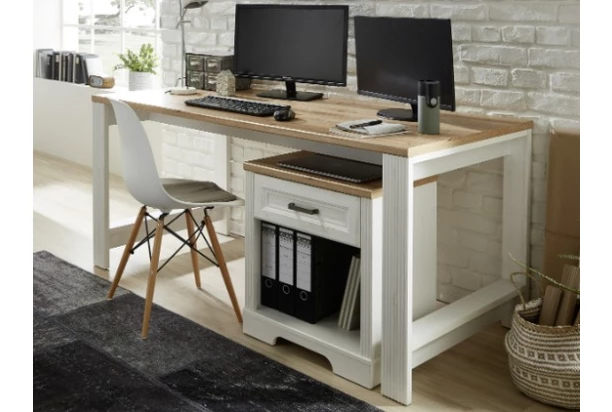 Písací stôl s veľkosťou 160×80 cm v prevedení bielená pínia s dubovým drevodekorom z kolekcie Jasmin – nábytok v modernom vidieckom štýle s dôrazom na detail, nadväzuje na tradíciu útulne zariadeného domova a priamo láka k tomu, aby ste si vytvorili prostredie, kde sa budete cítiť dobre. Kombinujte tak jednotlivé elementy z tohto radu a vytvorte si štýlový rustikálny interiér s nádychom tradície.