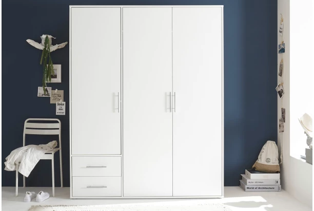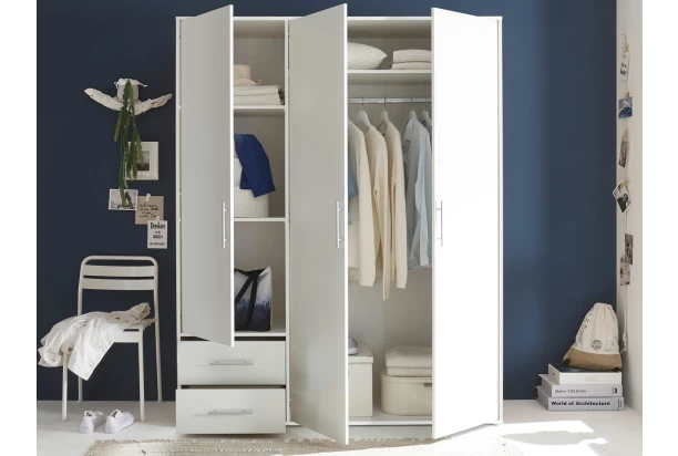 Klasická šatníková skriňa so šírkou 155 cm v prevedení biela. Praktické väčšie úchyty, dobre padnú do ruky pri otváraní 3 otočných dverí alebo 2 zásuviek. Vnútri skrine, nájdete aj šatníkovú tyč aj police.