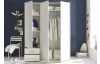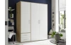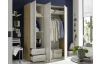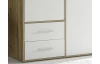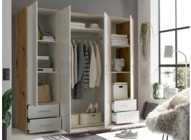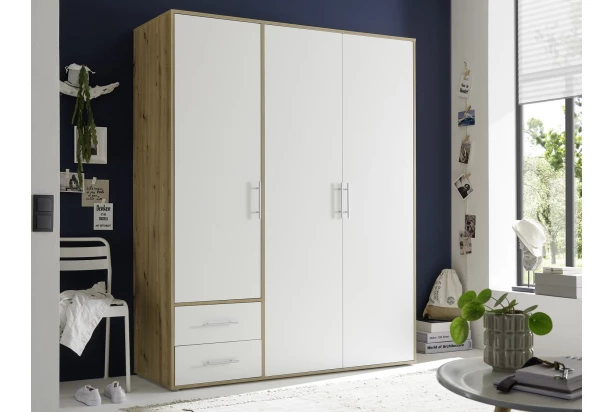 Klasická šatníková skriňa so šírkou 155 cm v prevedení dub artisan/biela. Praktické väčšie úchyty, dobre padnú do ruky pri otváraní 3 otočných dverí alebo 2 zásuviek. Vnútri skrine, nájdete aj šatníkovú tyč aj police.