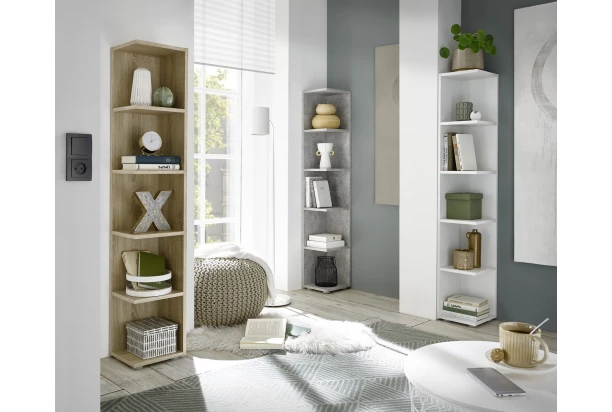 Rohový regál v imitácii šedý betón s 5 priehradkami poslúži na ukladanie akýchkoľvek drobných predmetov alebo dekorácií. Vďaka svojim rozmerom nájde svoje miesto takmer v každom kúte miestnosti.