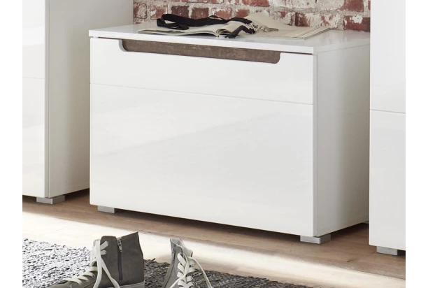 Predsieňová lavica/botník z programu Turin – štýlový nábytok so zaoblenými líniami predných plôch, pôsobí v interiéri predsiene elegantne. Lesklé a matné biele povrchy, kontrastujú s optikou hnedého drevodekoru.