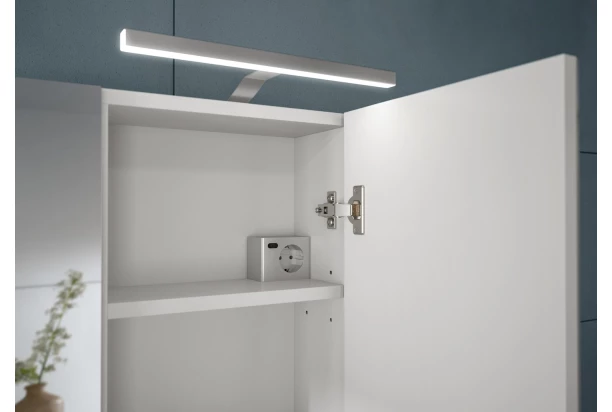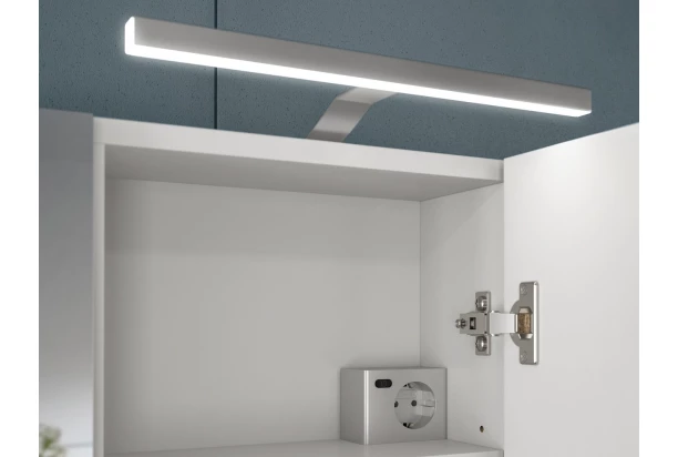 Horné LED osvetlenie pre nasvietenie kúpeľňovej skrinky so zrkadlom. Vrátane praktického boxu so zásuvkou a vypínačom, ktorý umiestnite dovnútra skrinky.