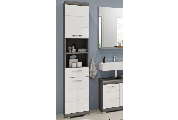 Vysoká kúpeľňová skrinka Scout, šedý dub/biela lesk