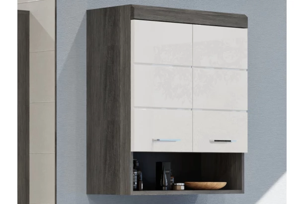 Nástenná skrinka z programu Scout – moderný, elegantný a zároveň praktický nábytok v kombinácii sivý dymový dub s lesklo bielymi plochami. Predné plochy so skosenou hranou a decentne frézovanými líniami sú príjemným detailom. Závesná skrinka obsahuje otvorenú priehradku a 2 otočné dvere, za ktorými nájdete úložný priestor. Táto skrinka na stenu prakticky poslúži nielen v priestore kúpeľne, ale aj kdekoľvek inde, kde potrebujete ukladať najrôznejšie veci.