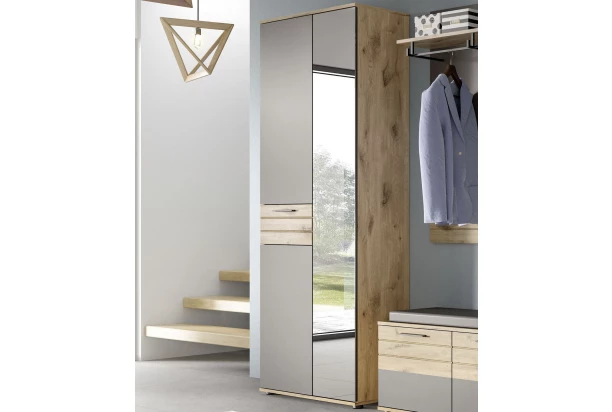 Predsieňová šatníková skriňa so zrkadlom z kolekcie Mason – moderný a praktický nábytok v kombinácii dubového drevodekoru a šedých plôch ozvláštňujú horizontálne frézované línie, ktoré dodávajú nábytku zaujímavý efekt. Vnútorný priestor s policami a šatníkovou tyčou si môžete upraviť podľa potreby. Moderný dizajn a vysoko kvalitné spracovanie z nej robí funkčný a esteticky príjemný kus nábytku do vášho domáceho prostredia.