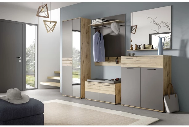 Predsieňová skrinka/botník z kolekcie Mason – moderný a praktický nábytok v kombinácii dubového drevodekoru a šedých plôch ozvláštňujú horizontálne frézované línie, ktoré dodávajú nábytku zaujímavý efekt. Moderný dizajn a vysoko kvalitné spracovanie z nej robí funkčný a esteticky príjemný kus nábytku do vášho domáceho prostredia.