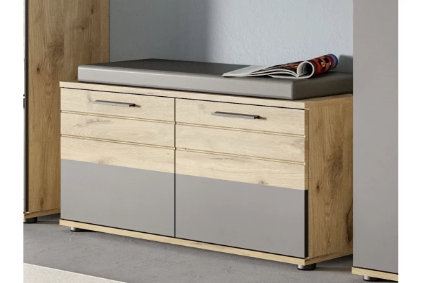 Predsieňová lavica s botníkom z kolekcie Mason – moderný a praktický nábytok v kombinácii dubového drevodekoru a šedých plôch ozvláštňujú horizontálne frézované línie, ktoré dodávajú nábytku zaujímavý efekt. Moderný dizajn a vysoko kvalitné spracovanie z nej robí funkčný a esteticky príjemný kus nábytku do vášho domáceho prostredia.