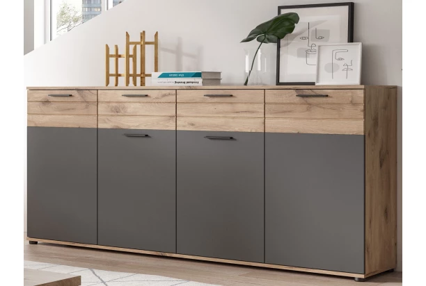 Široká komoda s celkovou šírkou 180 cm z kolekcie Mason – moderný a praktický nábytok v kombinácii dubového drevodekoru a šedých plôch ozvláštňujú horizontálne frézované línie, ktoré dodávajú nábytku zaujímavý efekt. Moderný dizajn a vysoko kvalitné spracovanie z nej robí funkčný a esteticky príjemný kus nábytku do vášho domáceho prostredia.