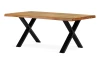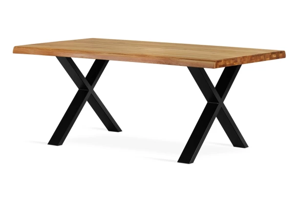 Jedálenský stôl s veľkosťou 180×100 cm je vyrobený z masívneho dubového dreva v kombinácii s čiernou kovovou podnožou v tvare X. Pre všetkých, ktorí majú radi prírodný drevený materiál a zároveň moderný štýl. Jedálenská doska zaujme zámerne zvlnenými hramanmi, vďaka ktorým vynikne efekt masivity.