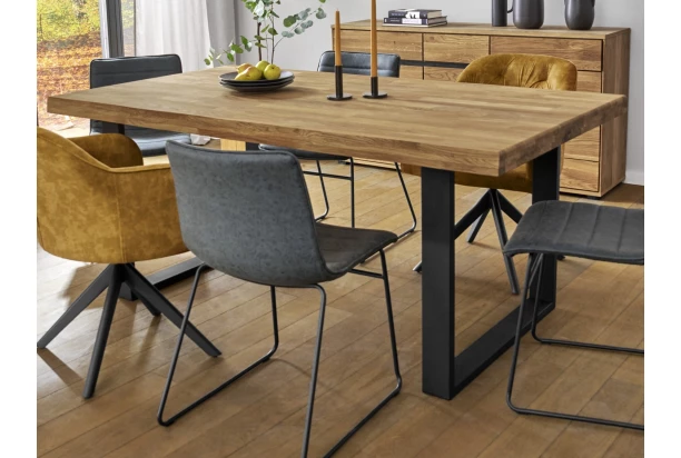 Jedálenský stôl s veľkosťou 180×100 cm je vyrobený z masívneho dubového dreva v kombinácii s čiernou kovovou podnožou v tvare U. Pre všetkých, ktorí majú radi prírodný drevený materiál a zároveň moderný štýl. Jedálenská doska s parketovým vzorom a rovnou bočnou hranou.