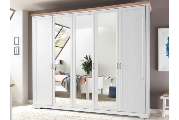 Šatníková skriňa so zrkadlami o celkovej šírke 264 cm v prevedení bielená pínia s dubovým drevodekorom z kolekcie Jasmin – nábytok v modernom vidieckom štýle s dôrazom na detail nadväzuje na tradíciu útulne zariadeného domova a priamo láka k tomu, aby ste si vytvorili prostredie, kde sa budete cítiť dobre. Kombinujte tak jednotlivé elementy z tohto radu a vytvorte si štýlový rustikálny interiér s nádychom tradície.