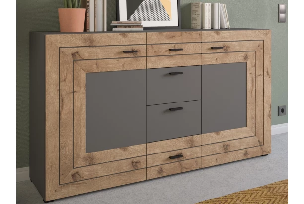 Široká komoda so zásuvkami z kolekcie Freno – moderný šedý nábytok dopĺňajú profilované povrchy v dubovom drevodekore, ktoré vytvárajú na predných plochách zaujímavý lamelový efekt. Nábytok je tak na pohľad zaujímavý a zároveň pôsobí útulne v interiéri.