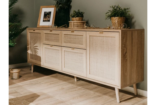 Široká komoda so zásuvkami z kolekcie Bali – vytvorte si útulný a zároveň krásne zariadený domov v prírodnom štýle. Atraktívny nábytok vo svetlých tónoch drevodekoru dub sonoma spolu s úžasnou imitáciou lykového výpletu dodá vášmu interiéru príjemne hrejivú atmosféru. Štýlový prírodný dizajn nábytku ,podčiarkujú masívne drevené nôžky, vďaka ktorým môžete ľahko udržovať podlahu v byte.