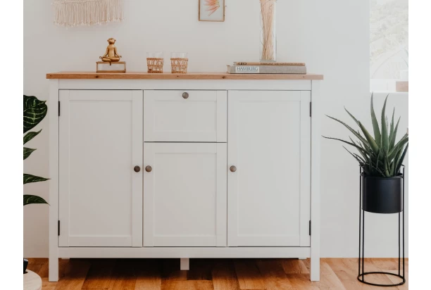 Komoda so zásuvkou z kolekcie Bergen – nábytok v pôvabnom vidieckom štýle je vyrobený v kombinácii biela/dub artisan. Predné plochy s výraznými reliéfmi dopĺňajú široké rámy a kovové úchytky s efektom patiny, ktoré dotvárajú celkový dizajn nábytku.