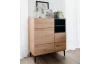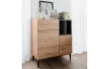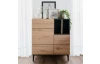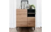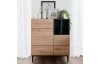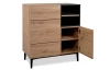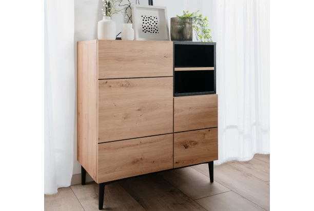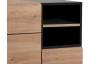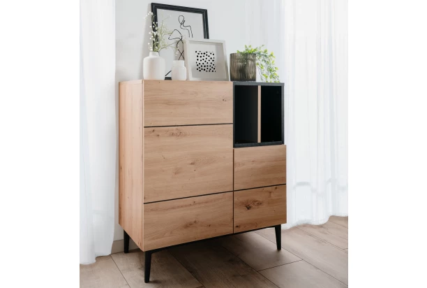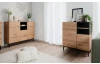 Skrinka 2-dverová z kolekcie Nola – ak máte radi moderný a zároveň zaujímavý design, potom je tento nábytok práve pre vás. Útulný dubový drevodekor dopĺňa kontrast zaujímavo vsadených čiernych plôch, čiernej horizontálnej línie a čierna podnož. Masívne pôsobiaci nábytok so zosilnenými rámami tak vďaka nôžkam vyzerá odľahčene a zároveň umožňuje jednoduchšiu údržbu podlahy.