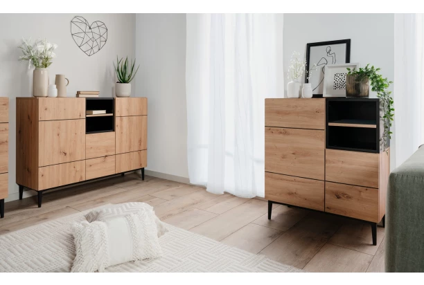 Skrinka 3-dverová z kolekcie Nola – ak máte radi moderný a zároveň zaujímavý design, potom je tento nábytok práve pre Vás. Útulný dubový drevodekor dopĺňa kontrast zaujímavo vsadených čiernych plôch, čiernej horizontálnej línie a čiernej podnože. Masívne pôsobiaci nábytok so zosilnenými rámami tak vďaka nôžkam vyzerá odľahčene a zároveň umožňuje jednoduchšiu údržbu podlahy.