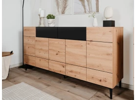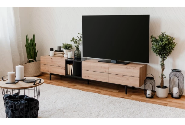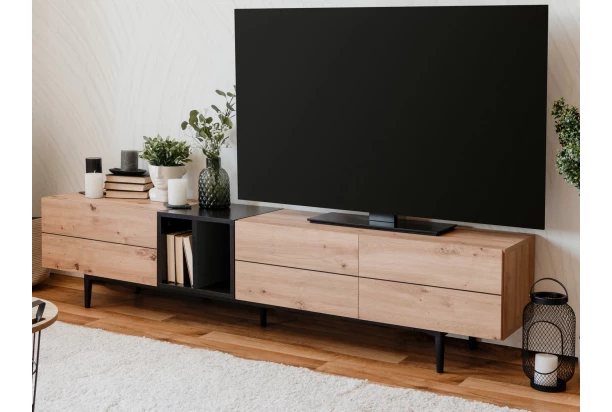 Široká TV skrinka z kolekcie Nola – ak máte radi moderný a zároveň zaujímavý design, potom je tento nábytok práve pre Vás. Útulný dubový drevodekor dopĺňa kontrast zaujímavo vsadených čiernych plôch, čiernej horizontálnej línie a čiernej podnože. Masívne pôsobiaci nábytok so zosilnenými rámami tak vďaka nôžkam vyzerá odľahčene a zároveň umožňuje jednoduchšiu údržbu podlahy.