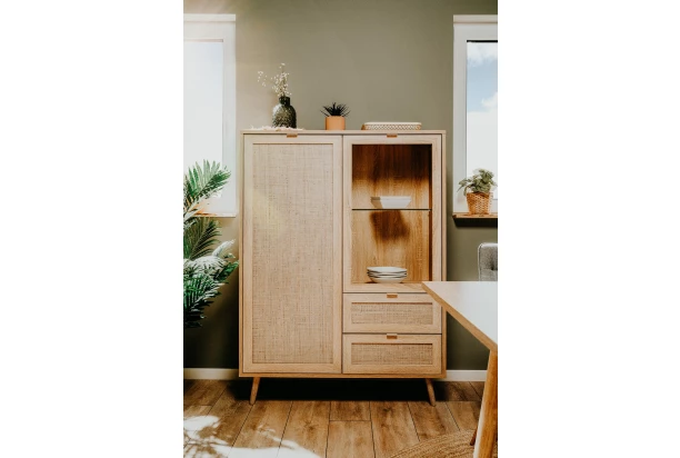 Vysoká skrinka s presklením z kolekcie Bali – vytvorte si útulný a zároveň krásne zariadený domov v prírodnom štýle. Atraktívny nábytok vo svetlých tónoch drevodekoru dub sonoma spolu s úžasnou imitáciou lykového výpletu dodá vášmu interiéru príjemne hrejivú atmosféru. Štýlový prírodný dizajn nábytku, podčiarkujú masívne drevené nôžky, vďaka ktorým môžete ľahko udržovať podlahu v byte.
