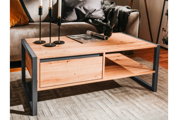 Konferenčný stolík so zásuvkou z kolekcie Denver – nábytok v mestskom industriálnom štýle, pôsobí veľmi moderne a dáva Vám možnosť vytvárať dizajnové interiéry v mladistvom duchu. Príjemné útulné tóny drevodekoru dub artisan dopĺňajú antracitovo šedé línie a široké bočné rámy, vďaka ktorým je nábytok nezameniteľný.