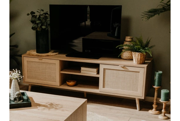 TV skrinka so šírkou 150 cm z kolekcie Bali – vytvorte si útulný a zároveň krásne zariadený domov v prírodnom štýle. Atraktívny nábytok vo svetlých tónoch drevodekoru dub sonoma spolu s úžasnou imitáciou lykového výpletu dodá vášmu interiéru príjemne hrejivú atmosféru. Štýlový prírodný dizajn nábytku, podčiarkujú masívne drevené nôžky, vďaka ktorým môžete ľahko udržovať podlahu v byte.