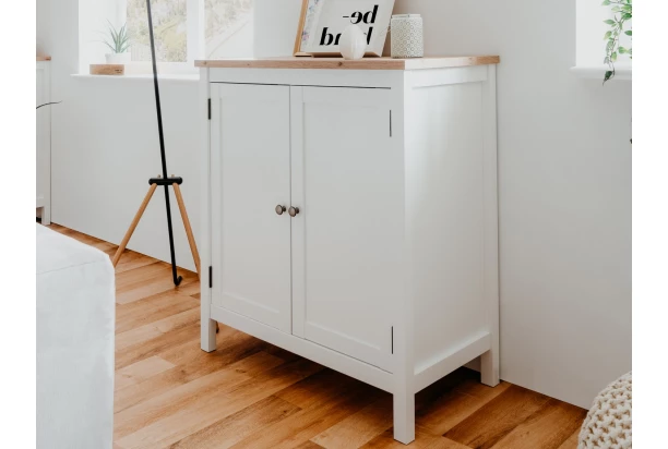 Skrinka 2-dverová z kolekcie Bergen – nábytok v pôvabnom vidieckom štýle je vyrobený v kombinácii biela/dub artisan. Predné plochy s výraznými reliéfmi dopĺňajú široké rámy a kovové úchytky s efektom patiny, ktoré dotvárajú celkový dizajn nábytku.