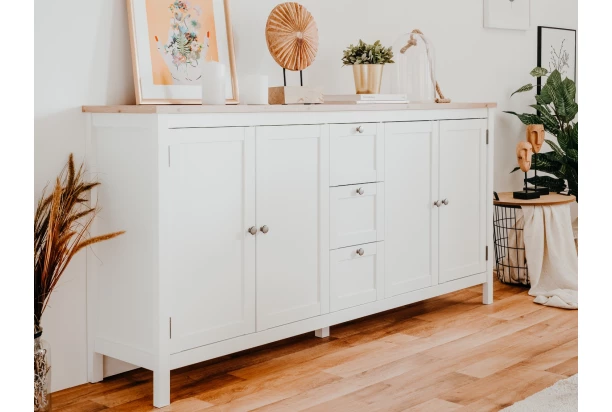 Široká úložná komoda z kolekcie Bergen – nábytok v pôvabnom vidieckom štýle je vyrobený v kombinácii biela/dub artisan. Predné plochy s výraznými reliéfmi dopĺňajú široké rámy a kovové úchytky s efektom patiny, ktoré dotvárajú celkový dizajn nábytku.