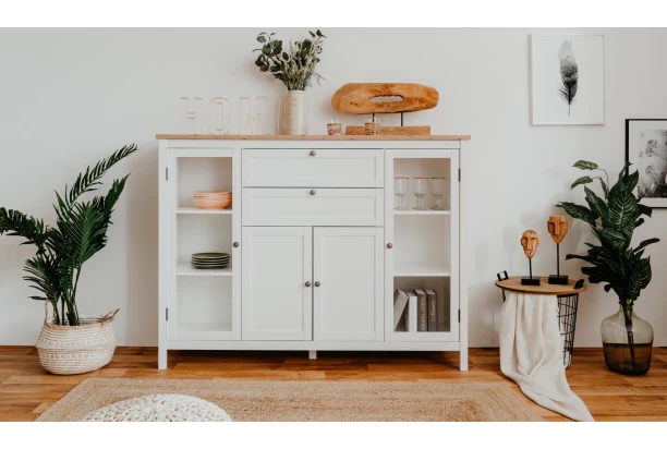 Vysoká komoda s presklením z kolekcie Bergen – nábytok v pôvabnom vidieckom štýle je vyrobený v kombinácii biela/dub artisan. Predné plochy s výraznými reliéfmi dopĺňajú široké rámy a kovové úchytky s efektom patiny, ktoré dotvárajú celkový dizajn nábytku.
